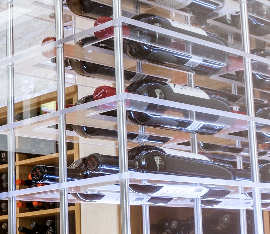 - Wine bottle cradles made with clear acrylic that is hand-honed to perfection