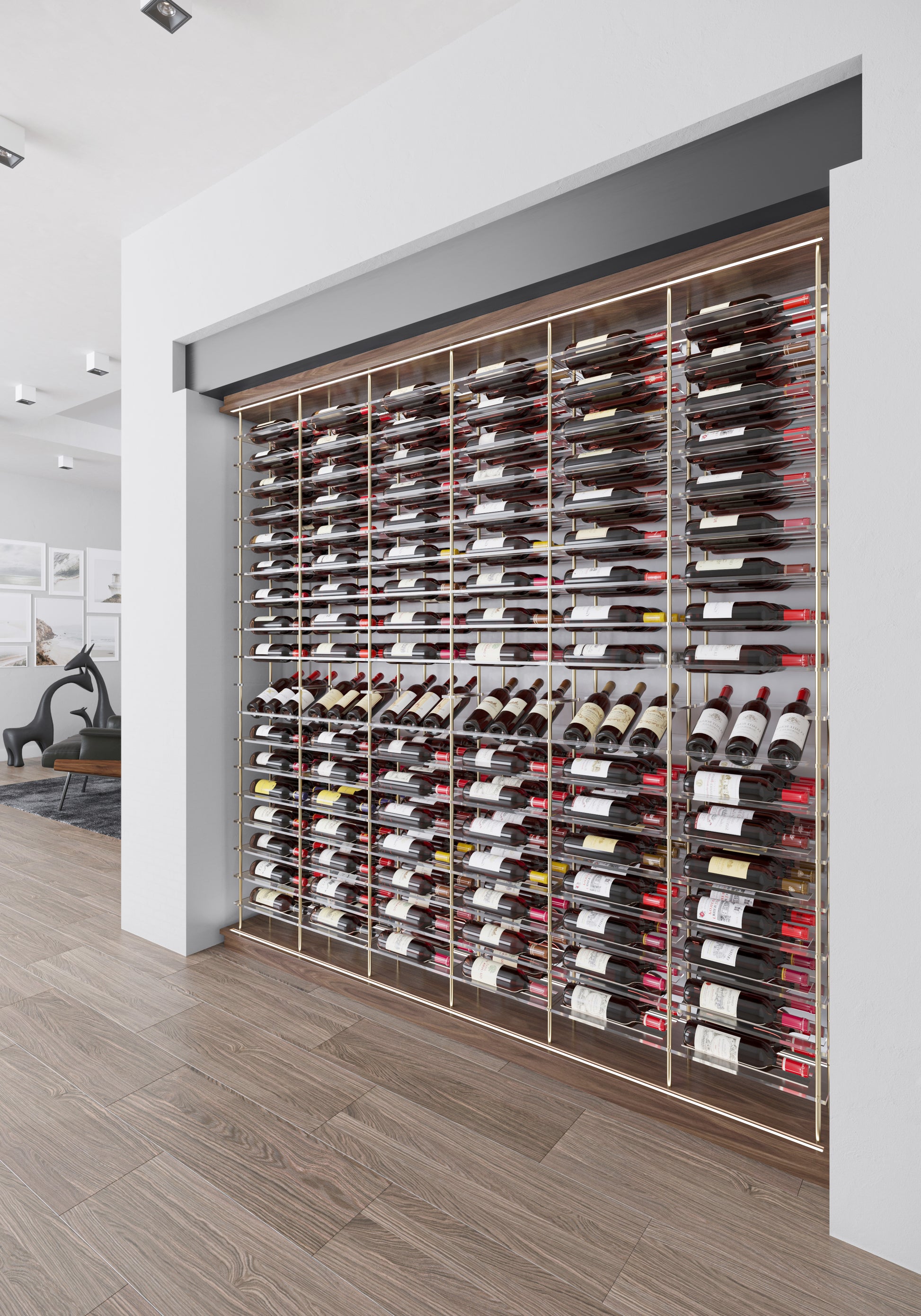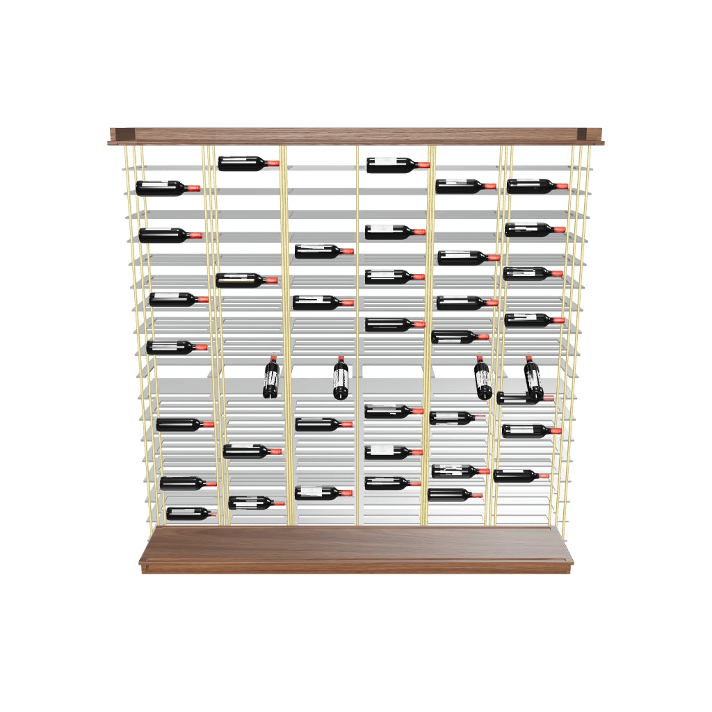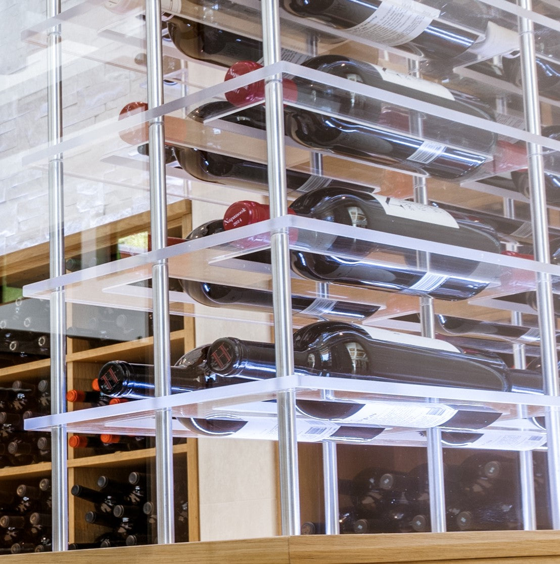 The 306-bottle Elevation Wine Wall Display features label-forward, three-deep, and angled display wine storage. Choose from 6 different options for the header and base materials and 3 wine post-finish options. The Wine Wall includes clear acrylic bottle cradles.