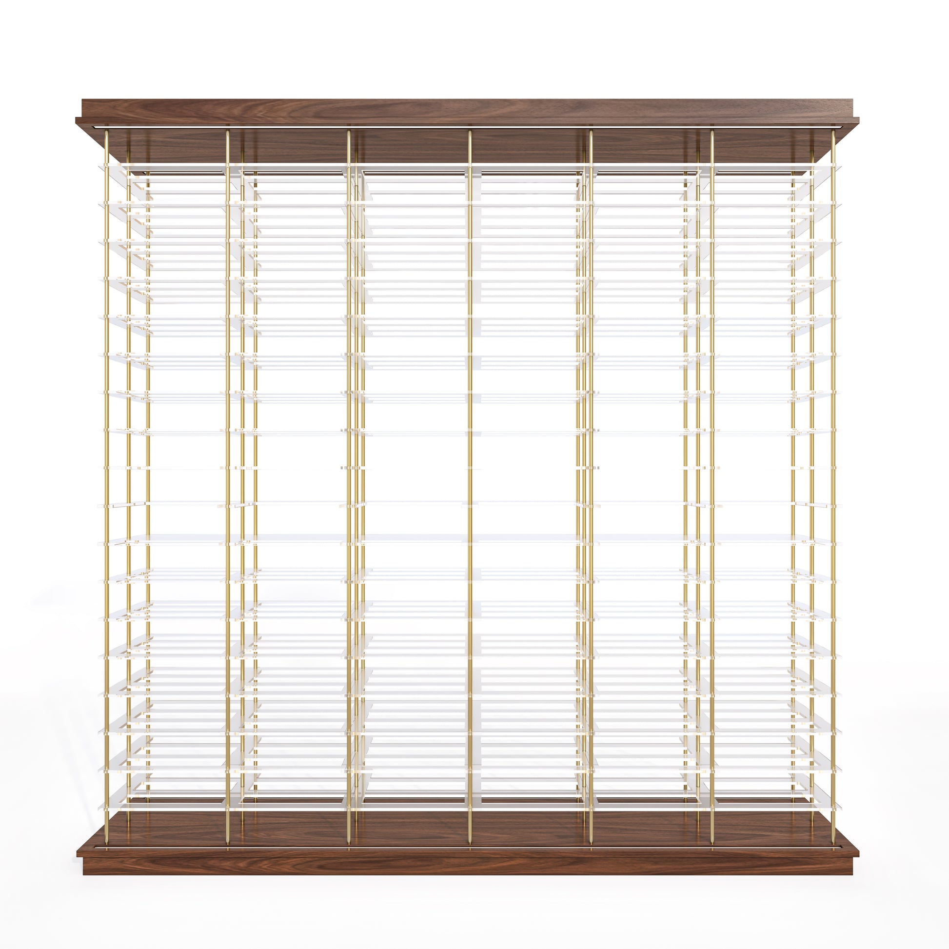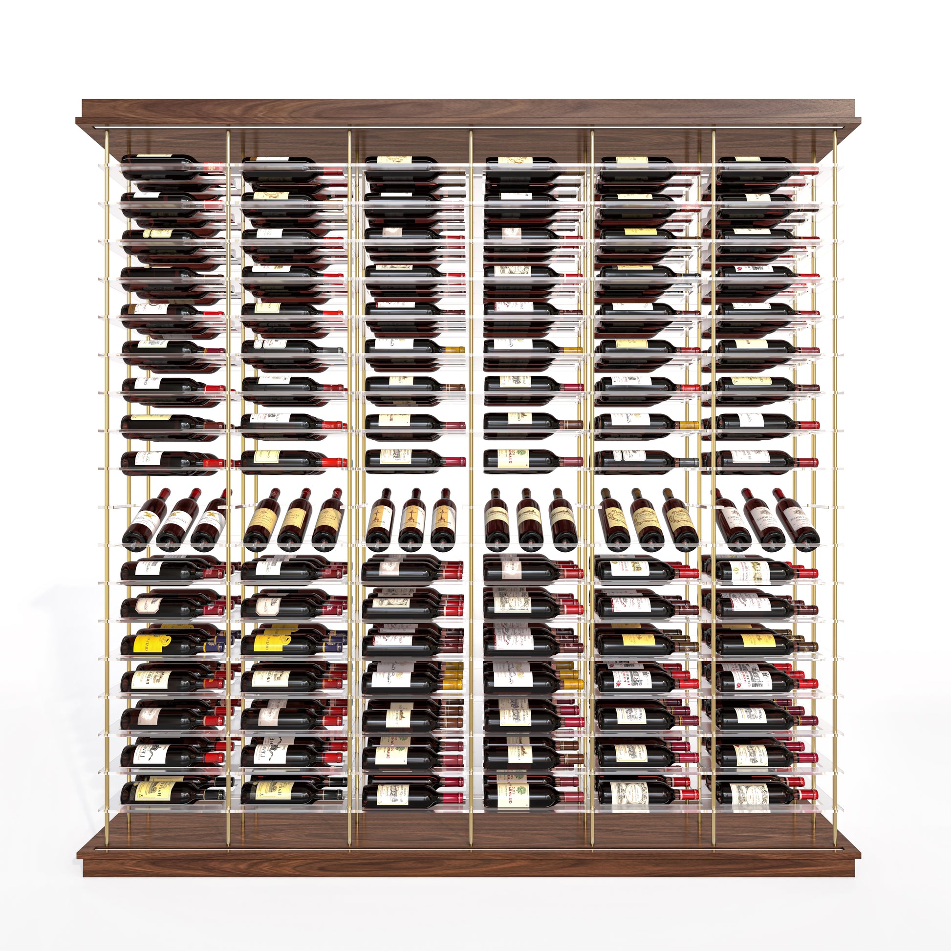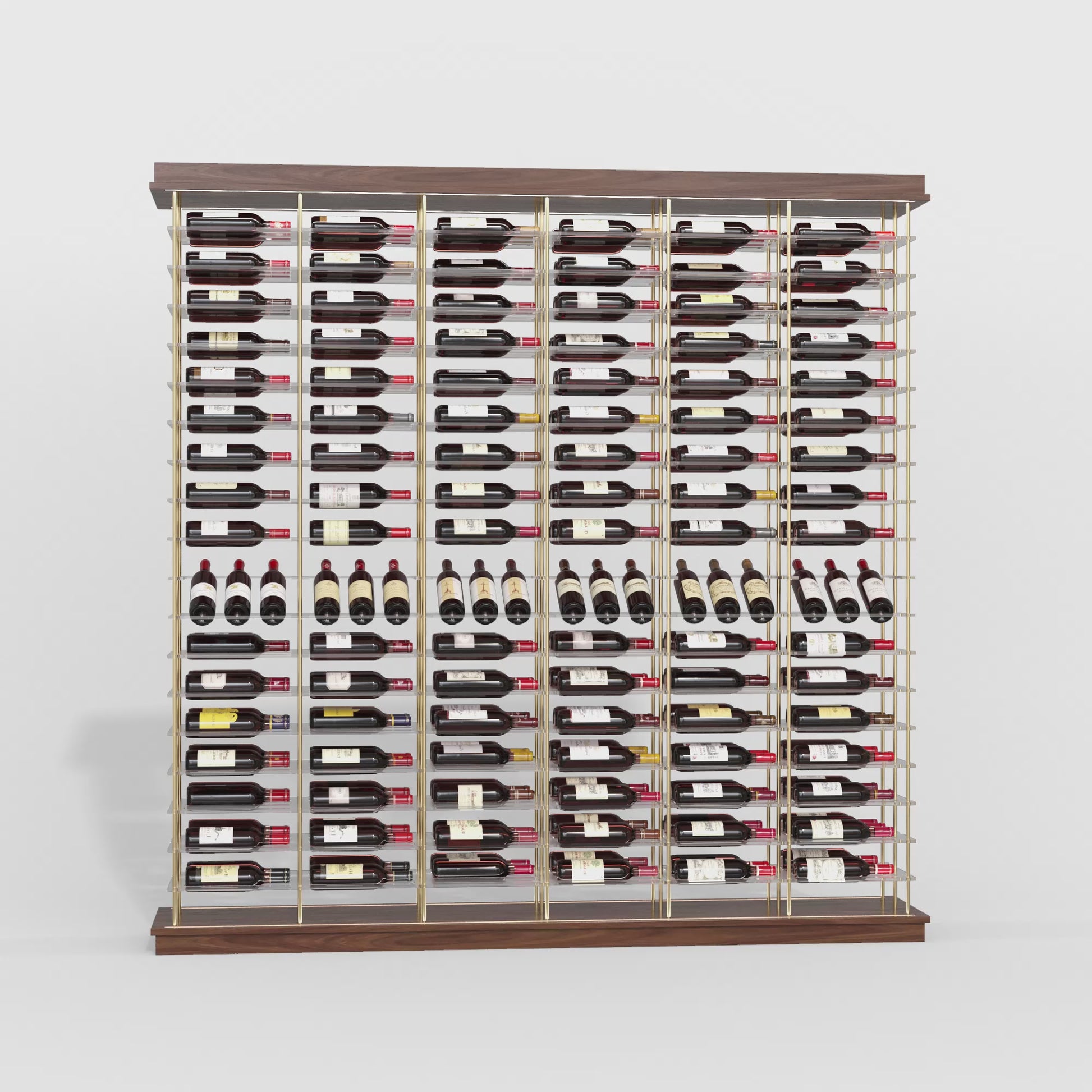 The 306-bottle Elevation Wine Wall Display features label-forward, three-deep, and angled display wine storage. Choose from 6 different options for the header and base materials and 3 wine post-finish options. The Wine Wall includes clear acrylic bottle cradles.