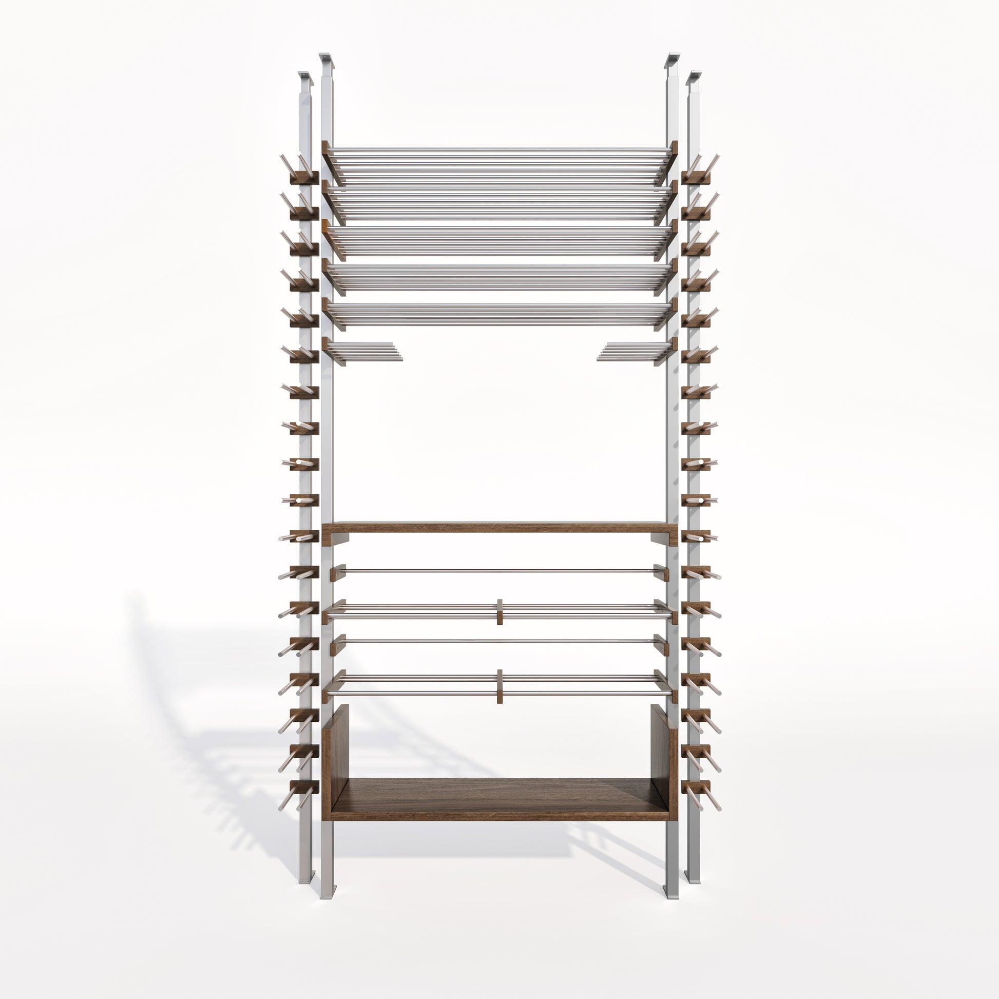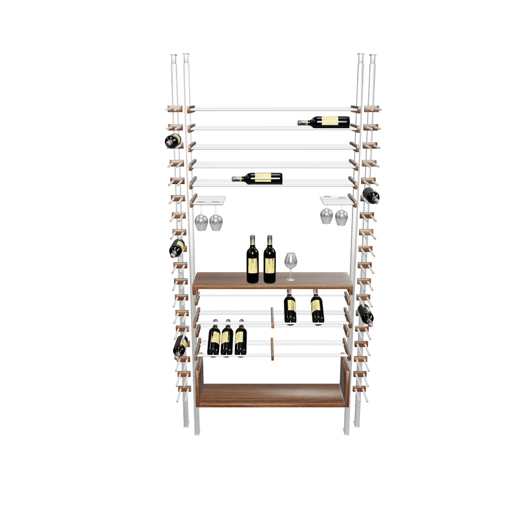 The 141-bottle Signature Wine Wall Display features 3-deep, label-forward, cork-forward, and angled display rows. On the lower portion of the wine racks, there is a large u-bin for bulk wine storage or to hold wine crates. An integrated stemware rack and pouring shelf can be used for spirits, decanters, or art pieces.