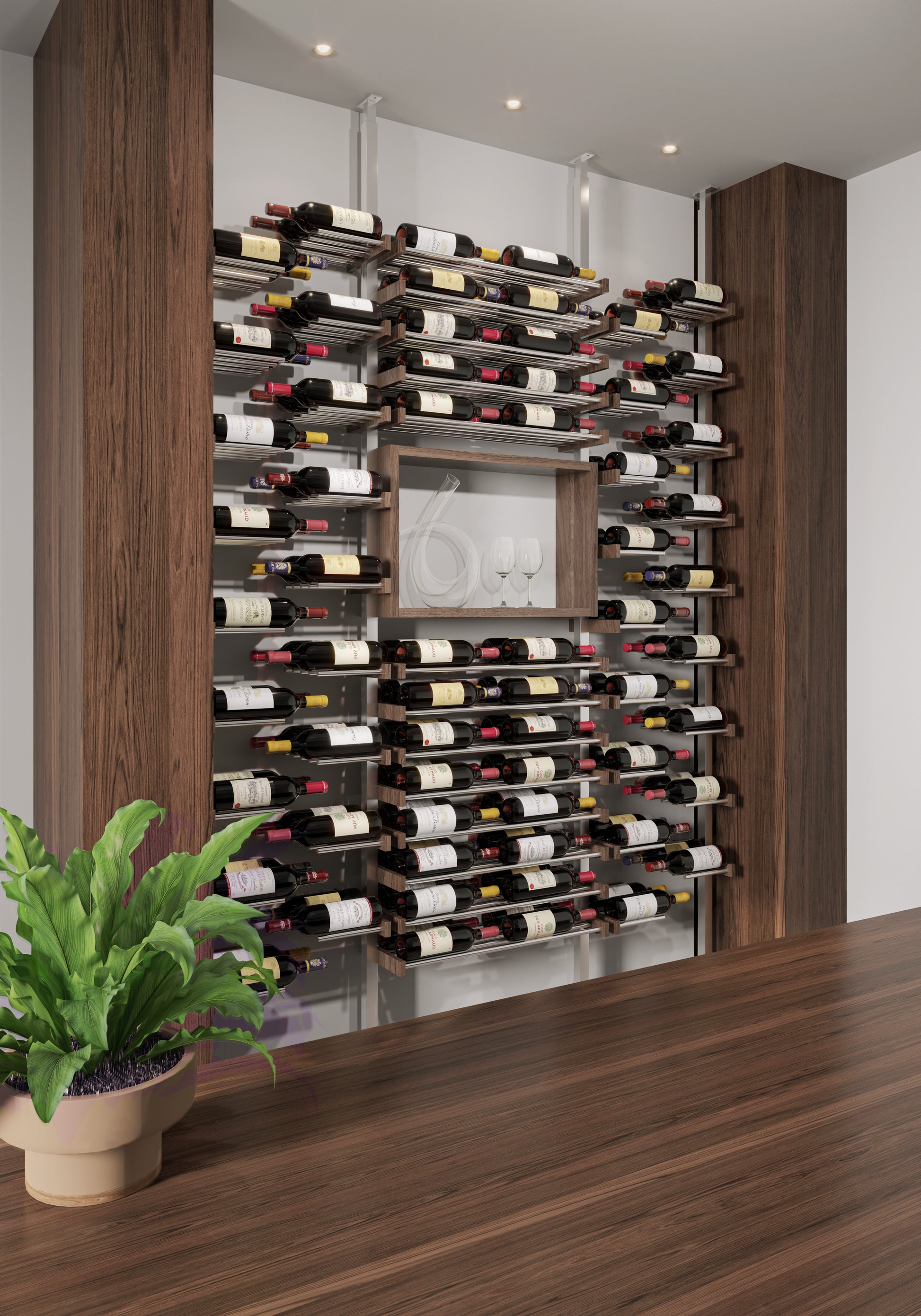 The 186-bottle Signature Wine Wall Display features 3-deep label-forward and floating bottles. Also includes a display shelf for spirits, decanter, or art pieces.