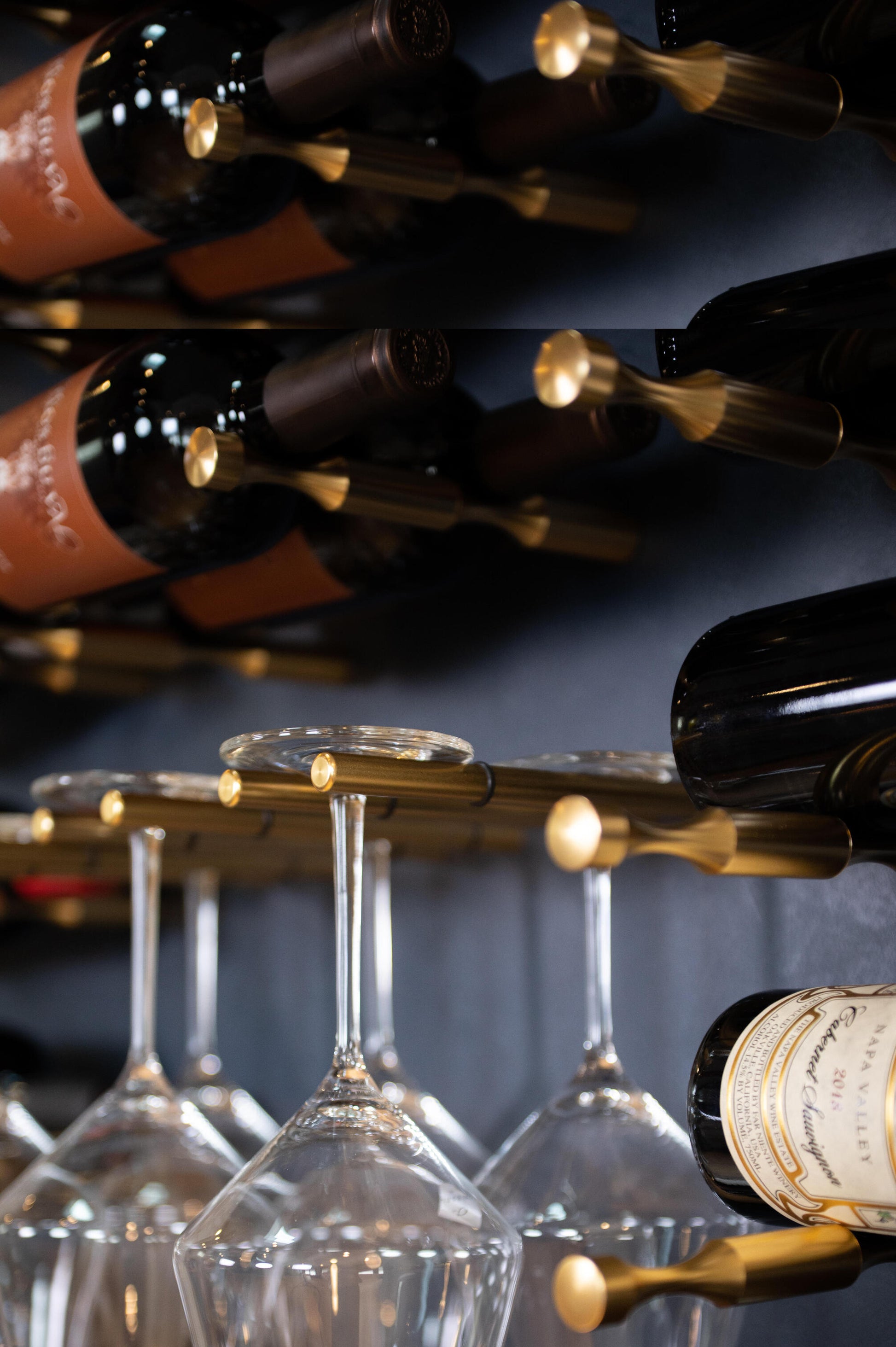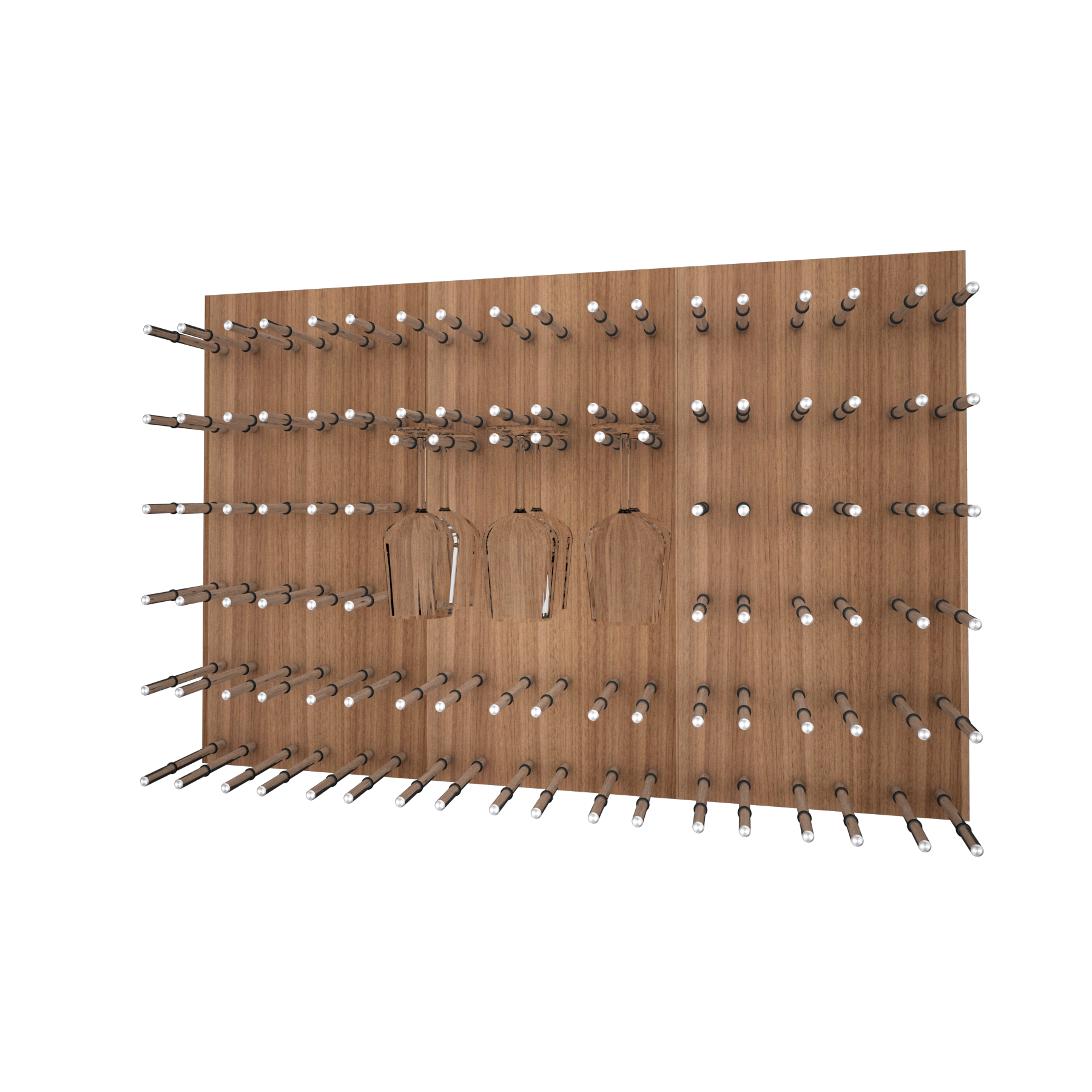 Wine Walls are designed to be unique wall mounted wine storage and wine display systems. Each design has a different wine configuration, bottle count and accessories. Wine Walls are engineered to be easily and securely installed utilizing the supplied ‘structural’ back panel method. Just select your panel option and hardware color to customize this design.