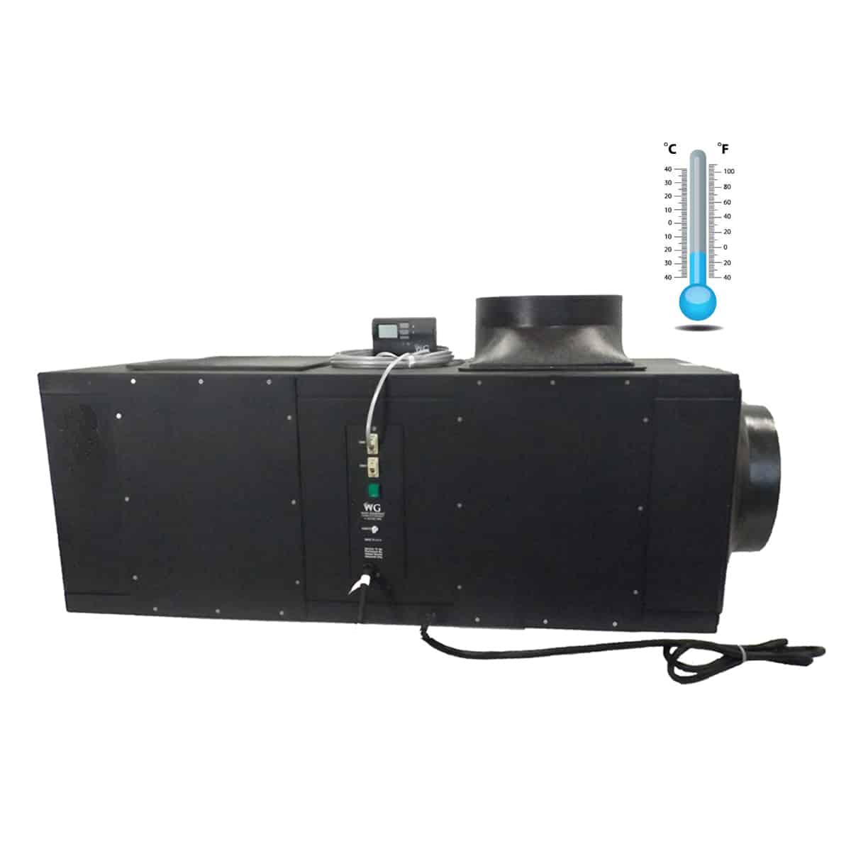 Self-contained, ducted Wine Guardian system for cooling large residential or commercial wine cellars. The entire unit is installed outside of the wine cellar. These systems are compatible with integrated or stand-alone humidifiers.
